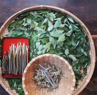 【 お山の恵み 】 お山からクロモジの枝葉を頂いてきた。 枝は 楊枝に葉は お茶に。 クロモジの香り大好きなのです